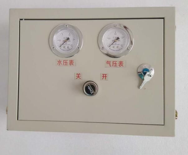 ZPFS氣控式風(fēng)水聯(lián)動(dòng)噴霧降塵裝置控制箱(以下簡(jiǎn)稱控制箱)采用內(nèi)置風(fēng)、水控制閥對(duì)裝置用風(fēng)、水壓力進(jìn)行調(diào)控,對(duì)風(fēng)水比例進(jìn)行均衡,采用氣控閥(控制箱圖片上的“開(kāi)關(guān)”)控制噴霧裝置的開(kāi)啟與關(guān)閉。控制箱門扇上鑲嵌氣控閥(開(kāi)關(guān)旋鈕)控制噴霧裝置的開(kāi)啟與關(guān)閉,鑲嵌有水壓表、氣壓表,分別顯示調(diào)控后的水、氣壓力。
